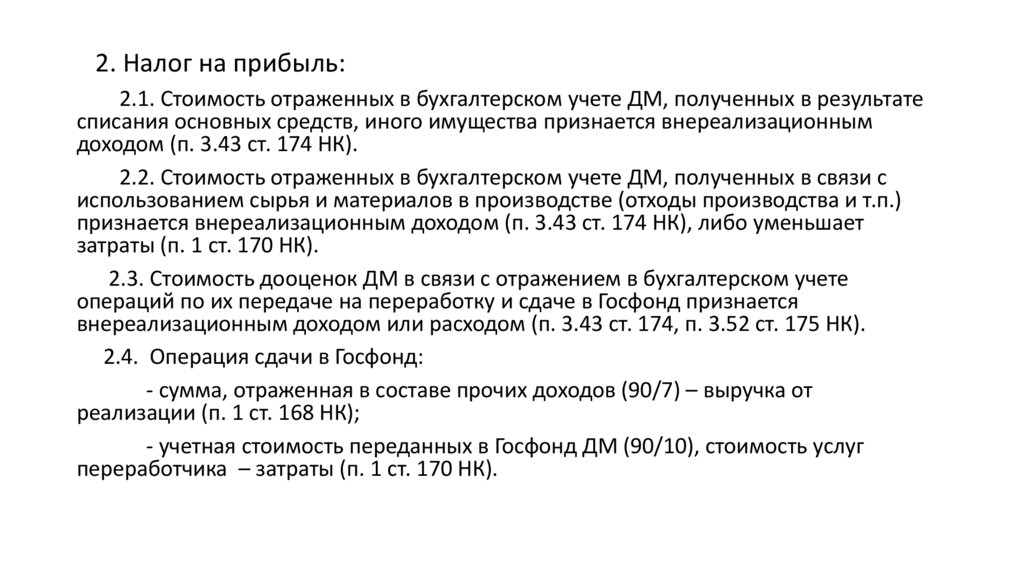2. Налог на прибыль:2.1. Стоимость отраженных в бухгалтерском учете ДМ, полученных в результате