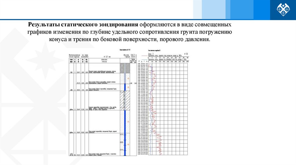 Результаты статического зондирования оформляются в виде совмещенныхграфиков изменения по глубине удельного сопротивления грунта погружению