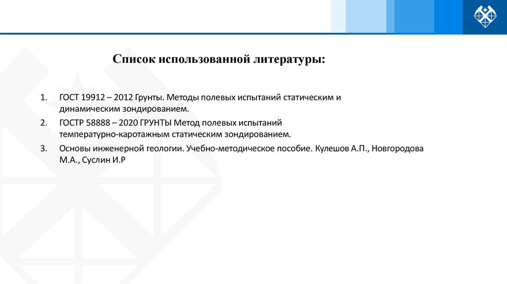 ГОСТ 19912 – 2012 Грунты. Методы полевых испытаний статическим и