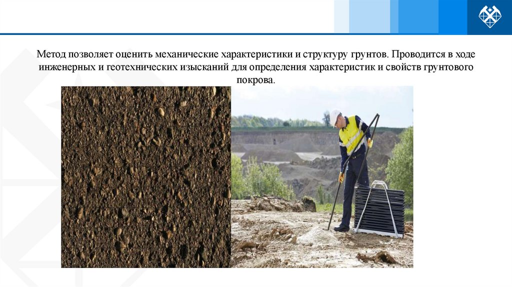 Метод позволяет оценить механические характеристики и структуру грунтов. Проводится в ходеинженерных и геотехнических изысканий для определения характеристик и свойств грунтового