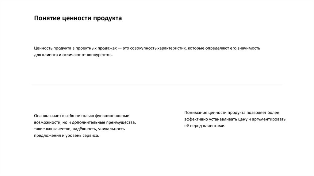 Понятие ценности продуктаЦенность продукта в проектных продажах — это совокупность характеристик, которые определяют его значимость