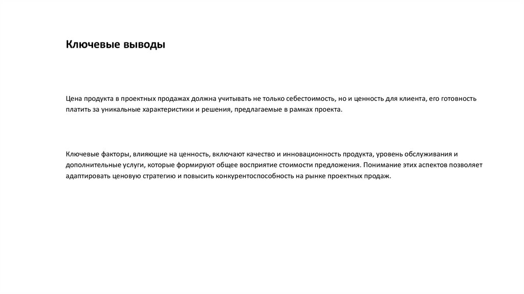 Ключевые выводыЦена продукта в проектных продажах должна учитывать не только себестоимость, но и ценность для клиента, его готовность