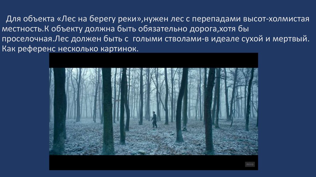 Для объекта «Лес на берегу реки»,нужен лес с перепадами высот-холмистаяместность.К объекту должна быть обязательно дорога,хотя бы