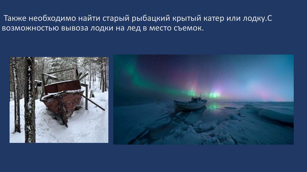 Также необходимо найти старый рыбацкий крытый катер или лодку.Свозможностью вывоза лодки на лед в место съемок.