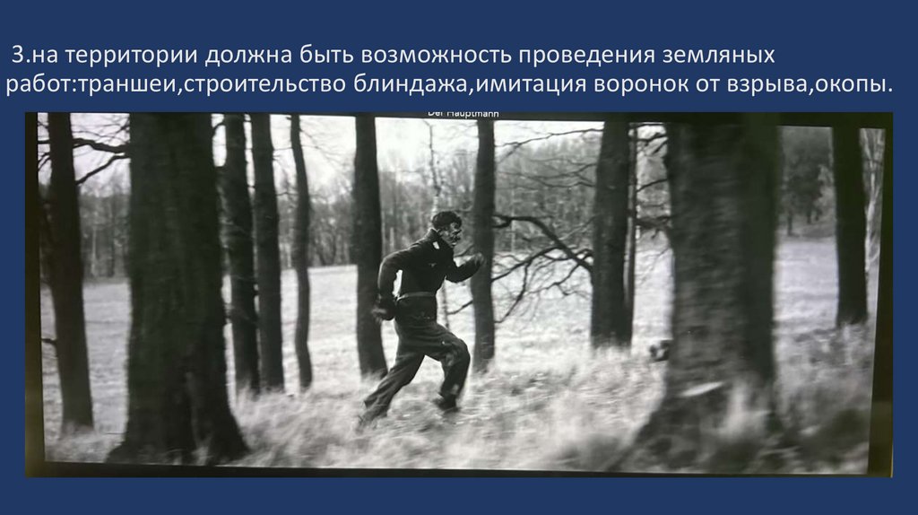 3.на территории должна быть возможность проведения земляныхработ:траншеи,строительство блиндажа,имитация воронок от взрыва,окопы.