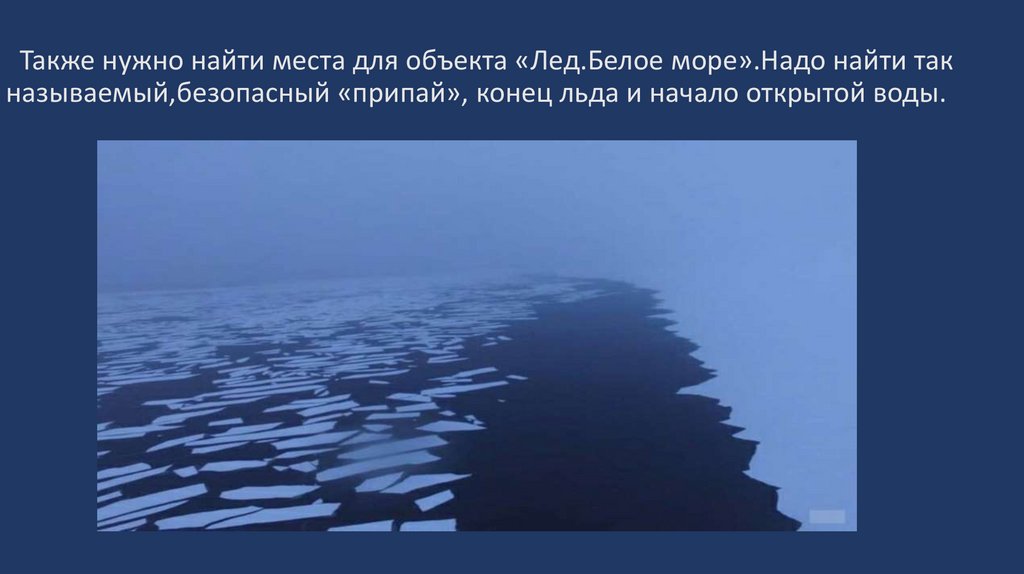 Также нужно найти места для объекта «Лед.Белое море».Надо найти такназываемый,безопасный «припай», конец льда и начало открытой воды.