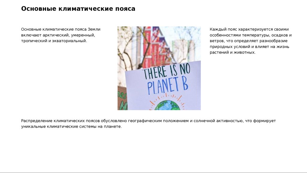 Распределение климатических поясов обусловлено географическим положением и солнечной активностью, что формирует