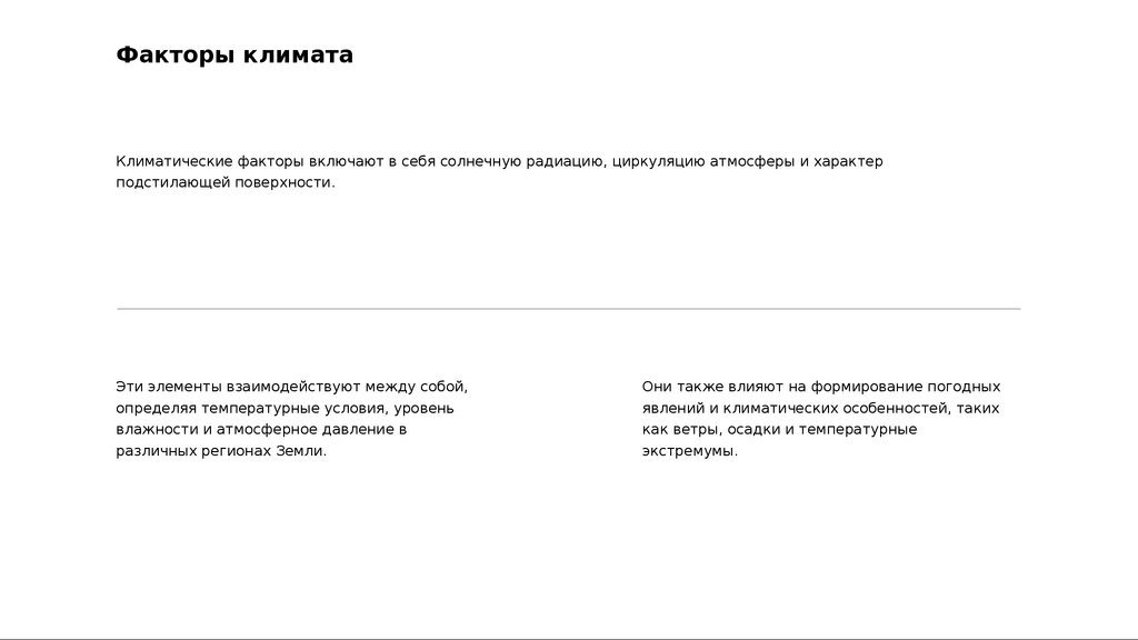 Факторы климатаКлиматические факторы включают в себя солнечную радиацию, циркуляцию атмосферы и характер