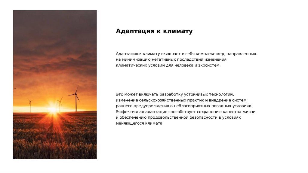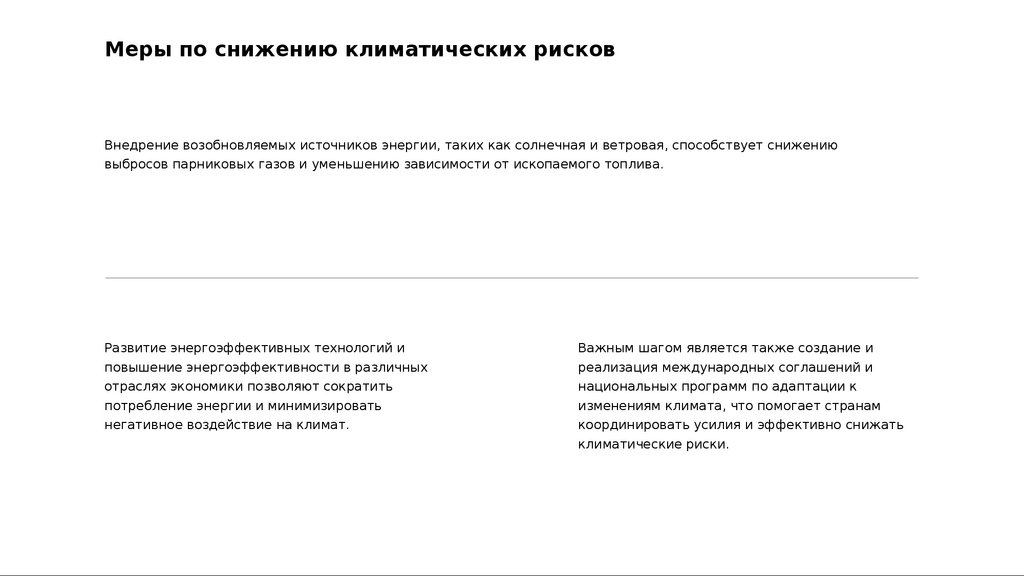 Меры по снижению климатических рисковВнедрение возобновляемых источников энергии, таких как солнечная и ветровая, способствует снижению
