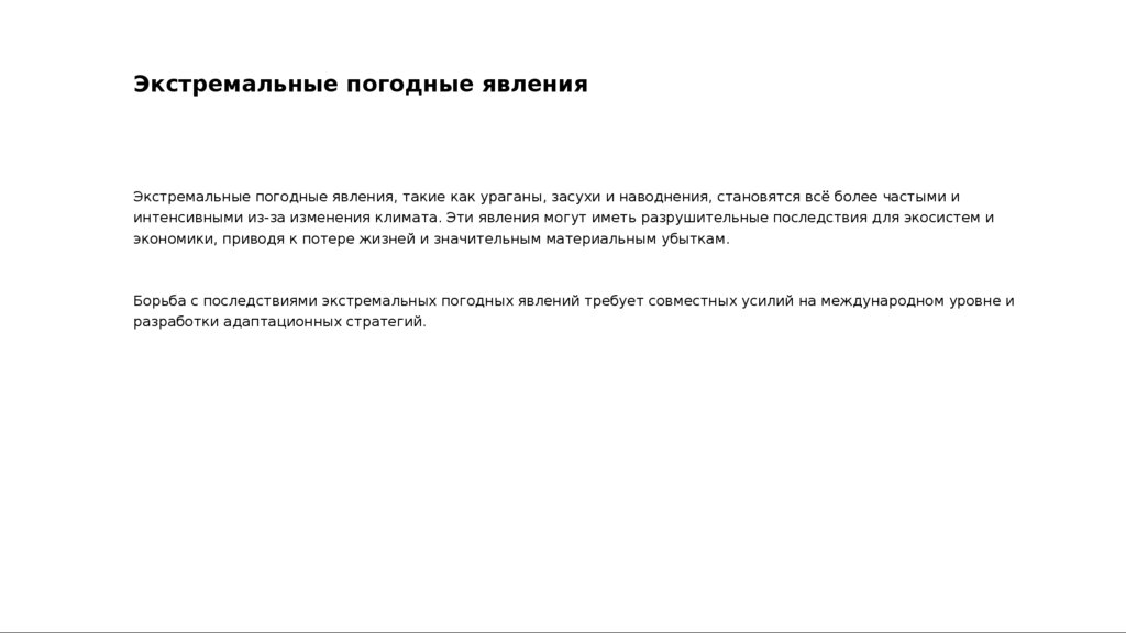 Экстремальные погодные явленияЭкстремальные погодные явления, такие как ураганы, засухи и наводнения, становятся всё более частыми и