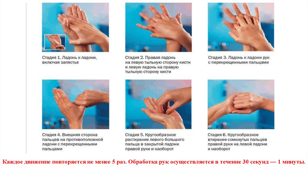 Каждое движение повторяется не менее 5 раз. Обработка рук осуществляется в течение 30 секунд — 1 минуты.11.