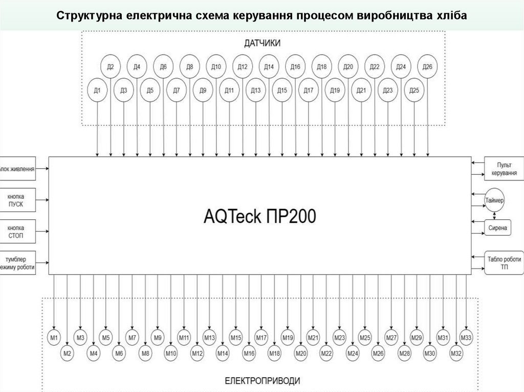 до блок-схеми, де описується крок за кроком від перевірки датчиками заданих показників до запуску електроприводів та агрегатів.
