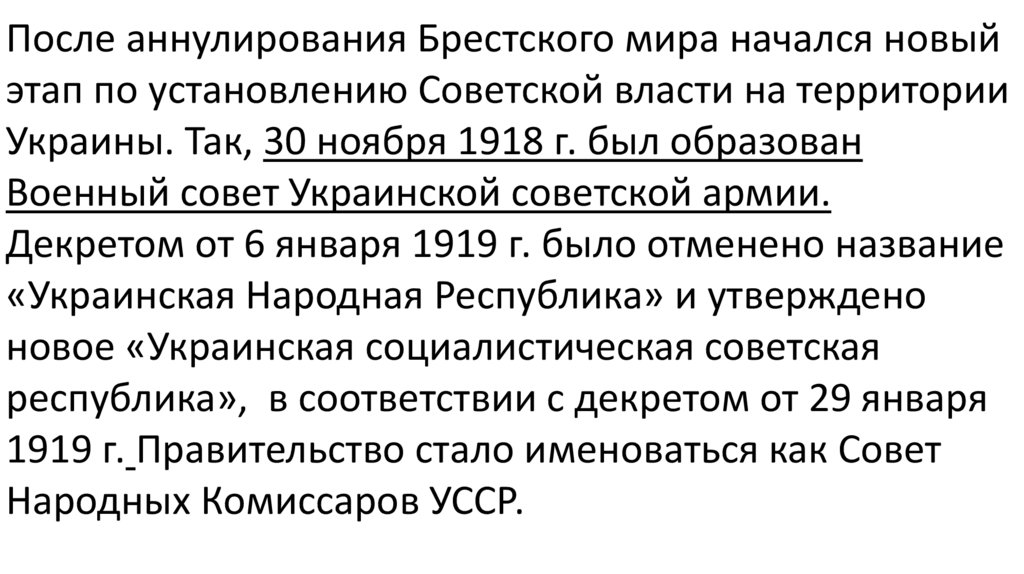 После аннулирования Брестского мира начался новыйэтап по установлению Советской власти на территории