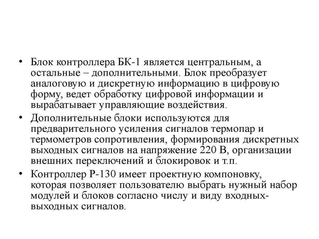 • Блок контроллера БК-1 является центральным, аостальные – дополнительными. Блок преобразует