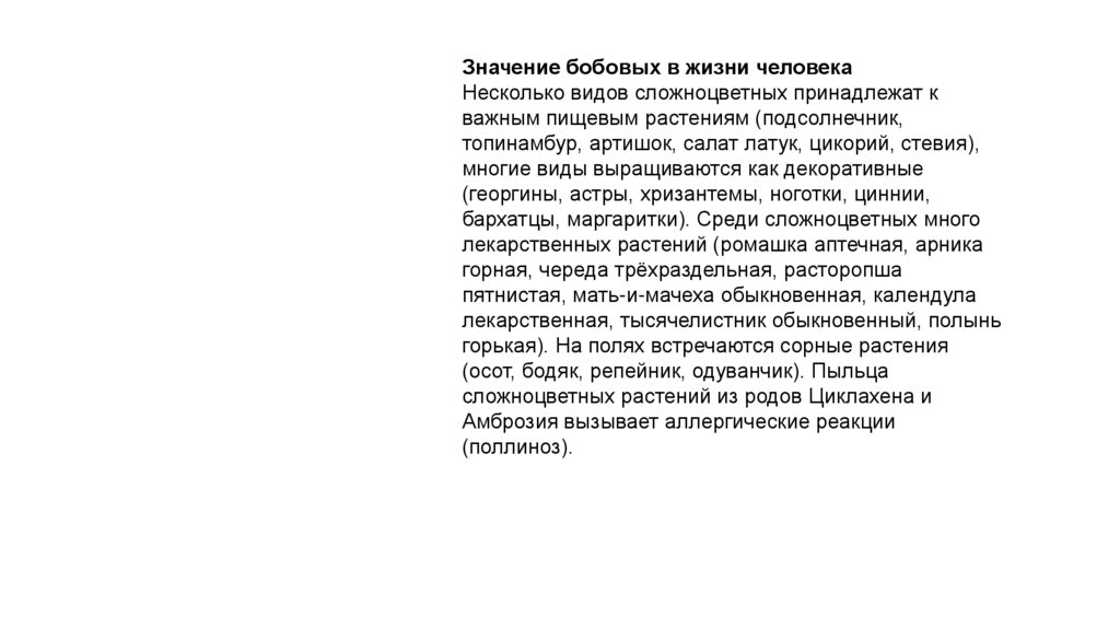 Значение бобовых в жизни человекаНесколько видов сложноцветных принадлежат к