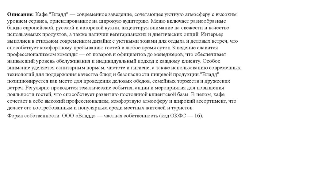 Описание: Кафе "Владд" — современное заведение, сочетающее уютную атмосферу с высокимуровнем сервиса, ориентированное на широкую аудиторию. Меню включает разнообразные