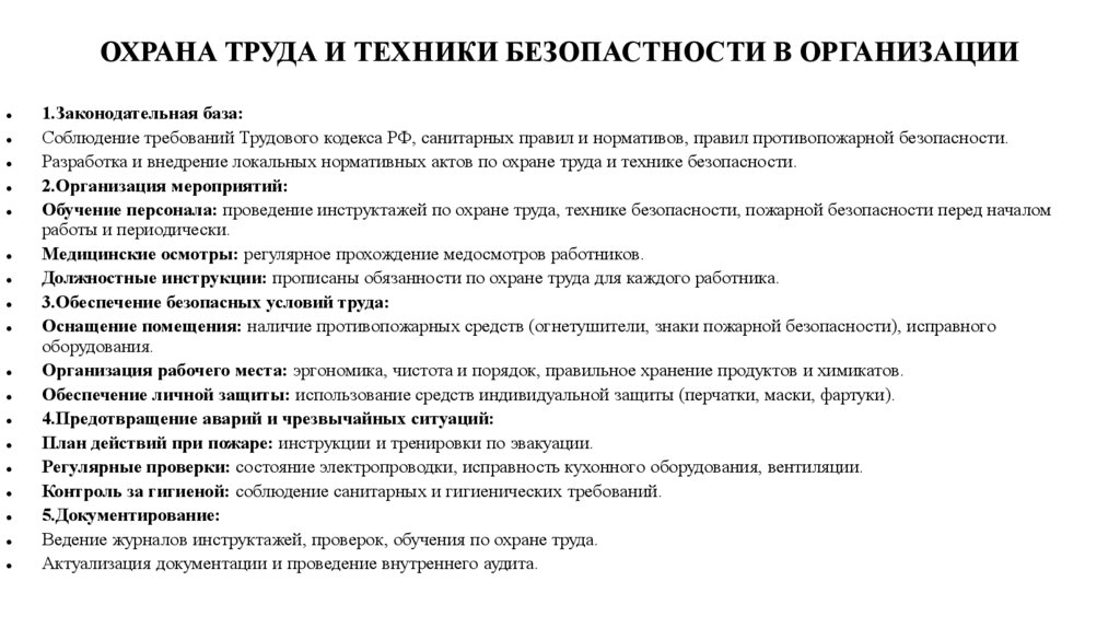 Соблюдение требований Трудового кодекса РФ, санитарных правил и нормативов, правил противопожарной безопасности.