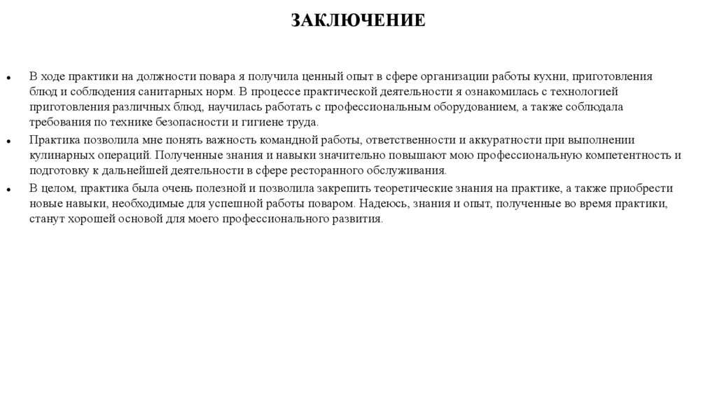 ЗАКЛЮЧЕНИЕВ ходе практики на должности повара я получила ценный опыт в сфере организации работы кухни, приготовления