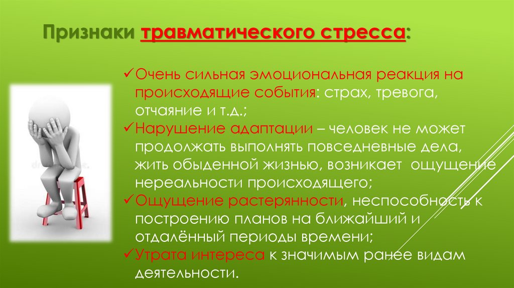 Признаки травматического стресса:Очень сильная эмоциональная реакция на