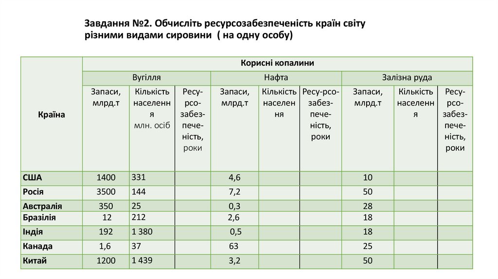 Завдання №2. Обчисліть ресурсозабезпеченість країн світурізними видами сировини ( на одну особу)