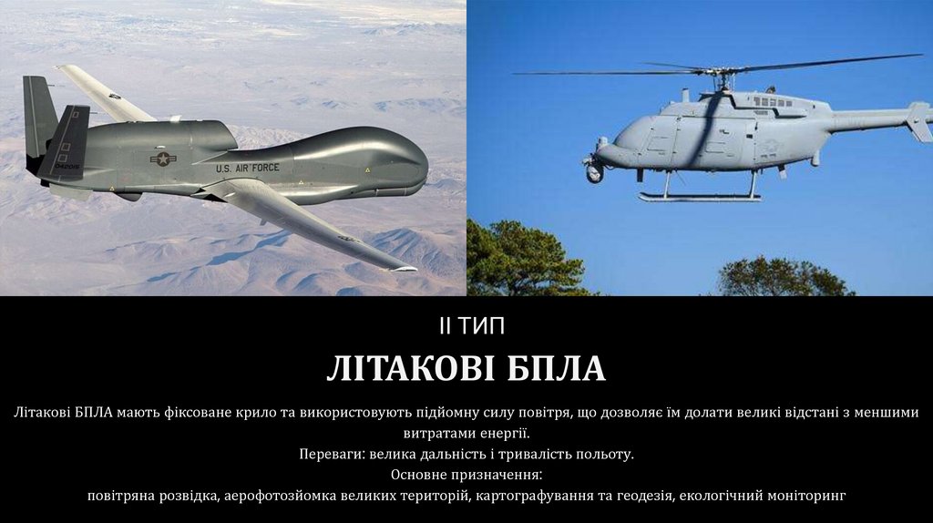 Літакові БПЛА мають фіксоване крило та використовують підйомну силу повітря, що дозволяє їм долати великі відстані з меншими