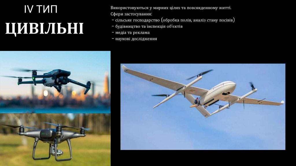 - сільське господарство (обробка полів, аналіз стану посівів)