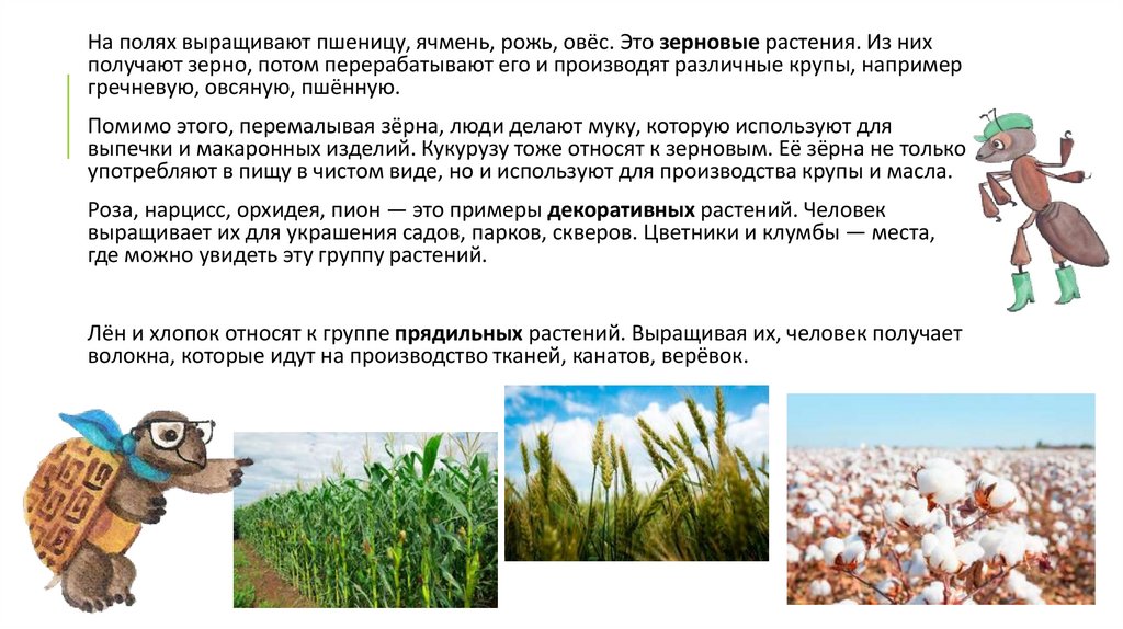На полях выращивают пшеницу, ячмень, рожь, овёс. Это зерновые растения. Из нихполучают зерно, потом перерабатывают его и производят различные крупы, например