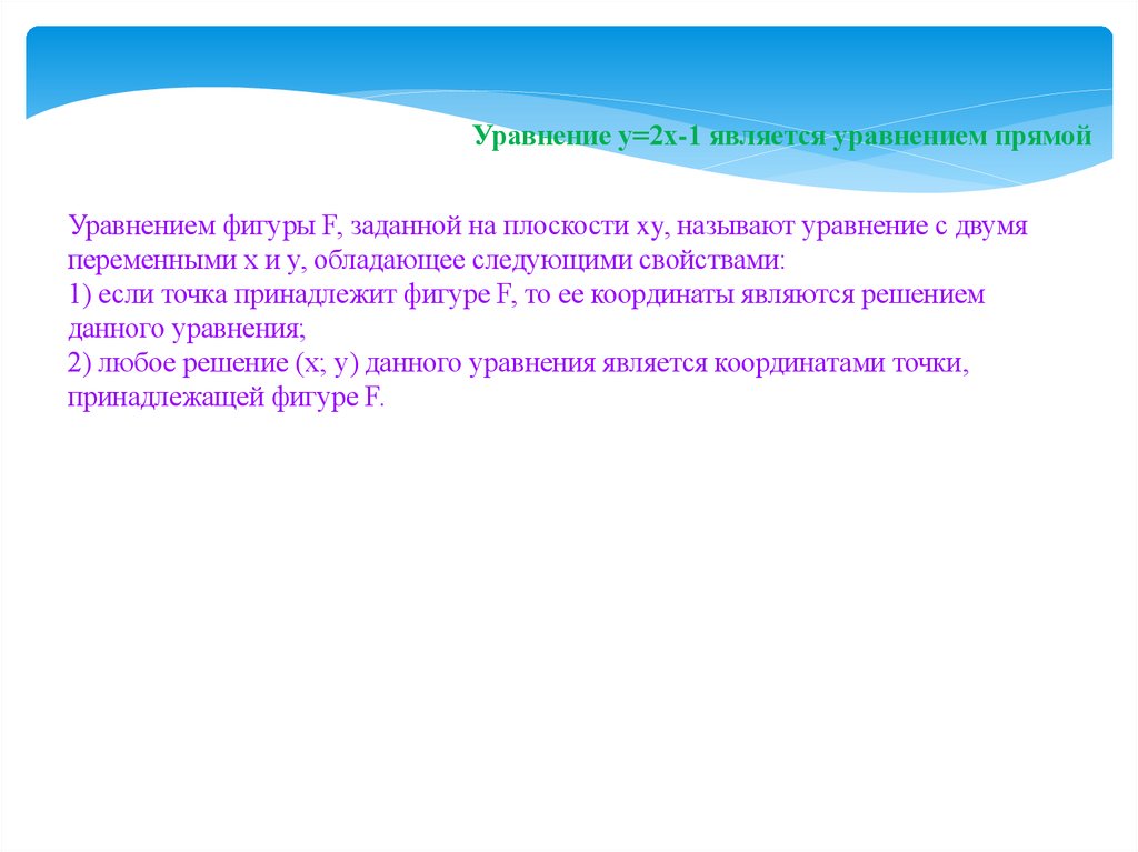 Уравнение у=2х-1 является уравнением прямойУравнением фигуры F, заданной на плоскости xy, называют уравнение с двумя