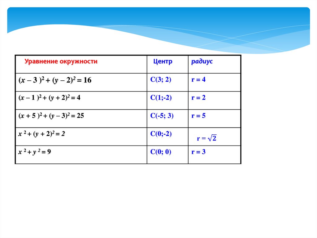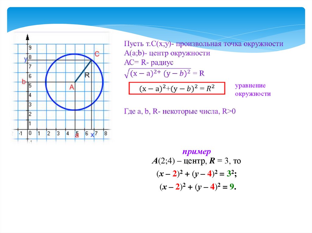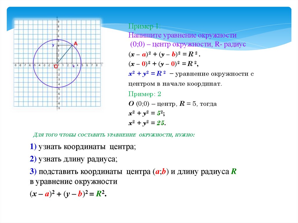 ДЛЯ ТОГО ЧТОБЫ СОСТАВИТЬ УРАВНЕНИЕ ОКРУЖНОСТИ, НУЖНО: