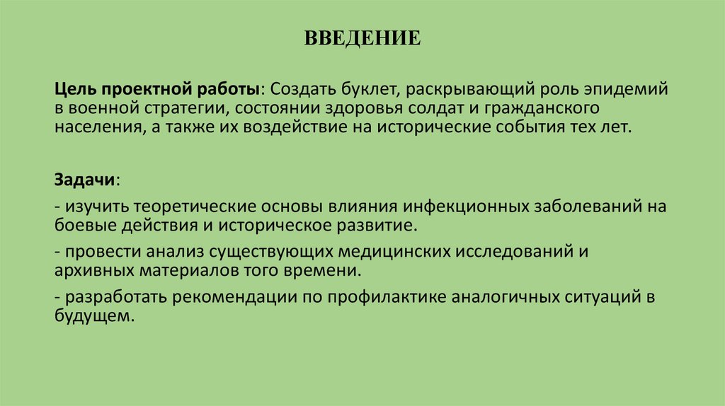 ВВЕДЕНИЕЦель проектной работы: Создать буклет, раскрывающий роль эпидемий