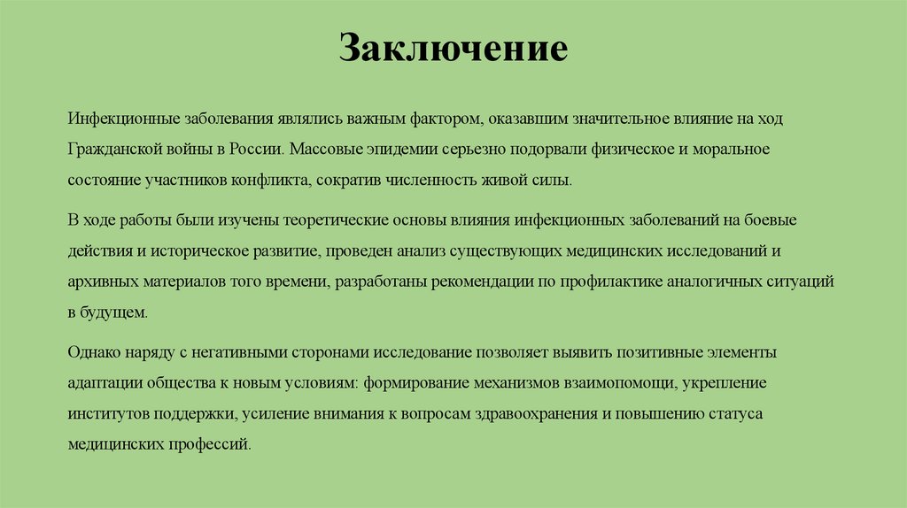 ЗаключениеИнфекционные заболевания являлись важным фактором, оказавшим значительное влияние на ход