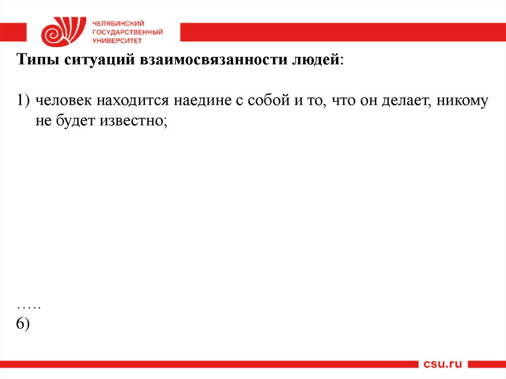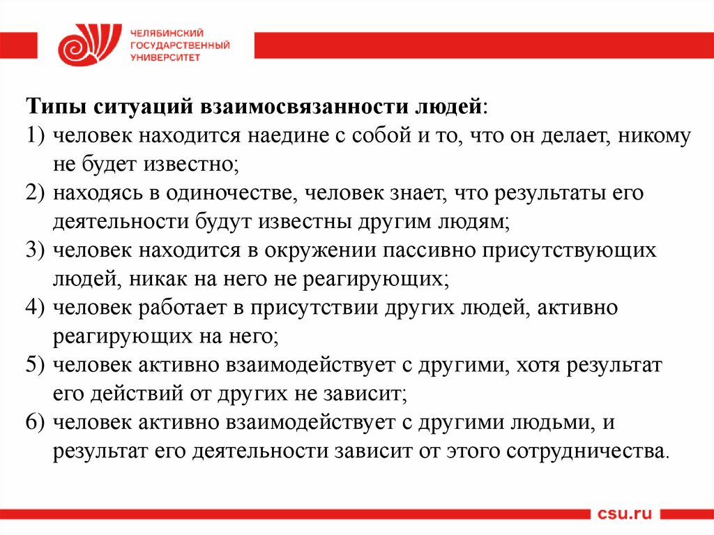 Типы ситуаций взаимосвязанности людей:1) человек находится наедине с собой и то, что он делает, никому