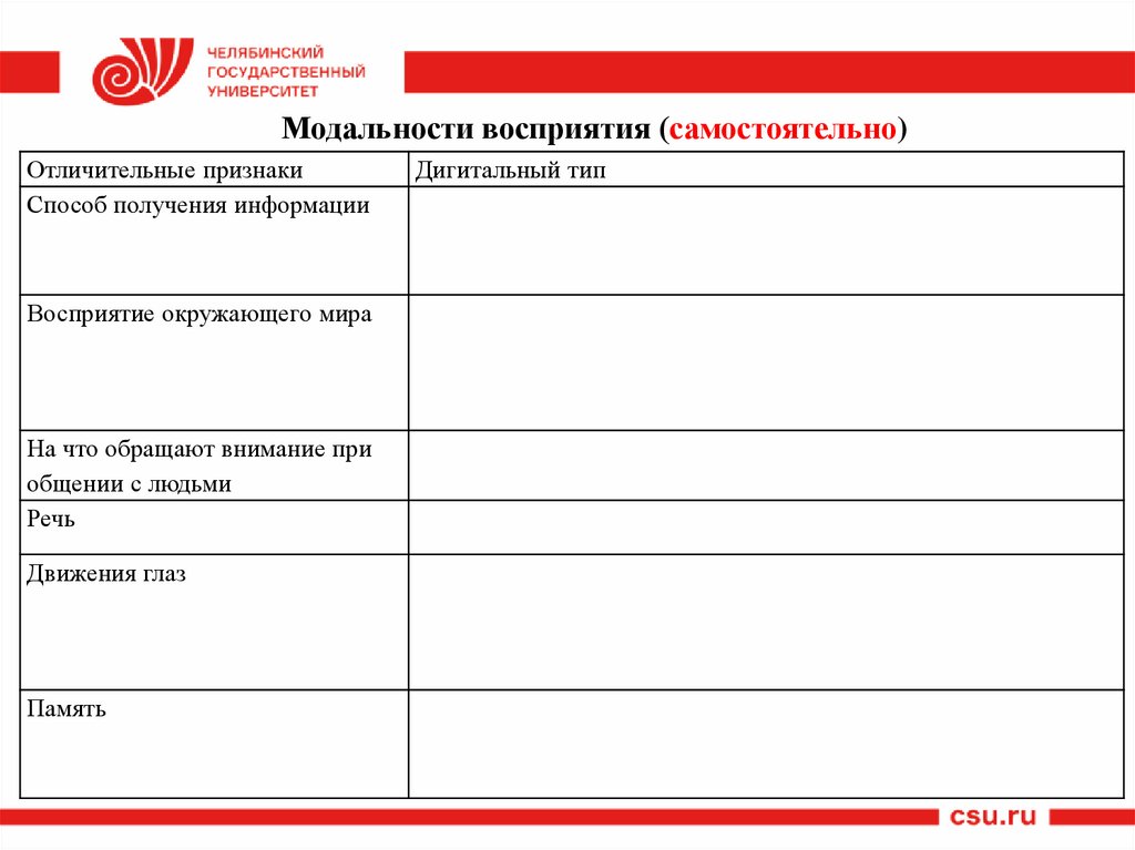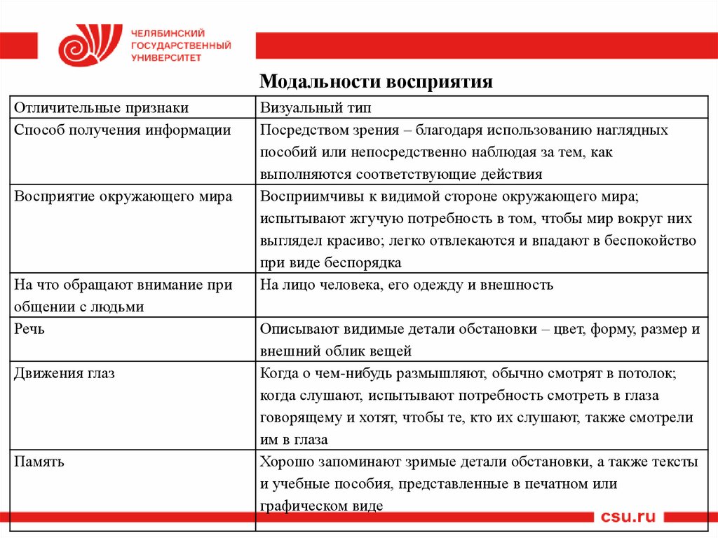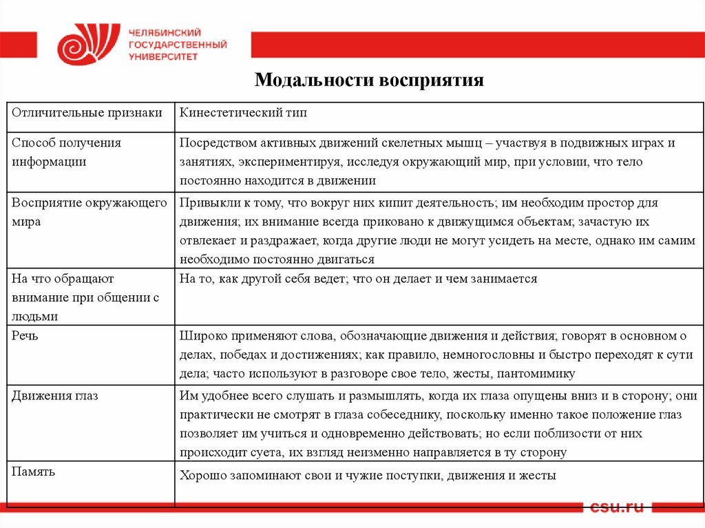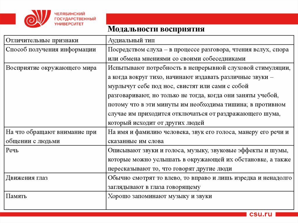Модальности восприятия (самостоятельно)Отличительные признаки