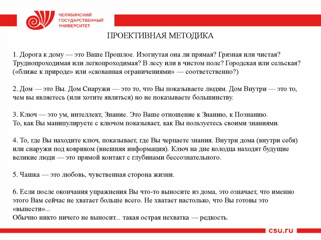 ПРОЕКТИВНАЯ МЕТОДИКА1. Дорога к дому — это Ваше Прошлое. Изогнутая она ли прямая? Грязная или чистая?