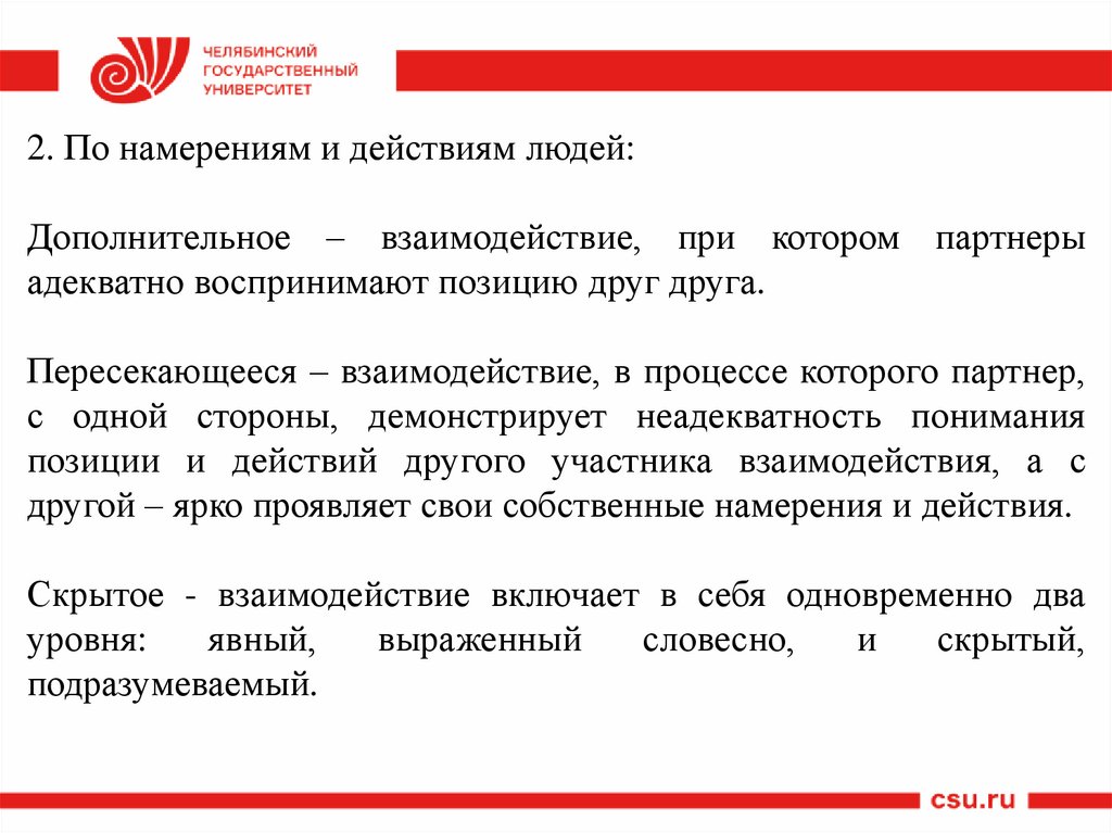 2. По намерениям и действиям людей:Дополнительное – взаимодействие, при котором партнеры