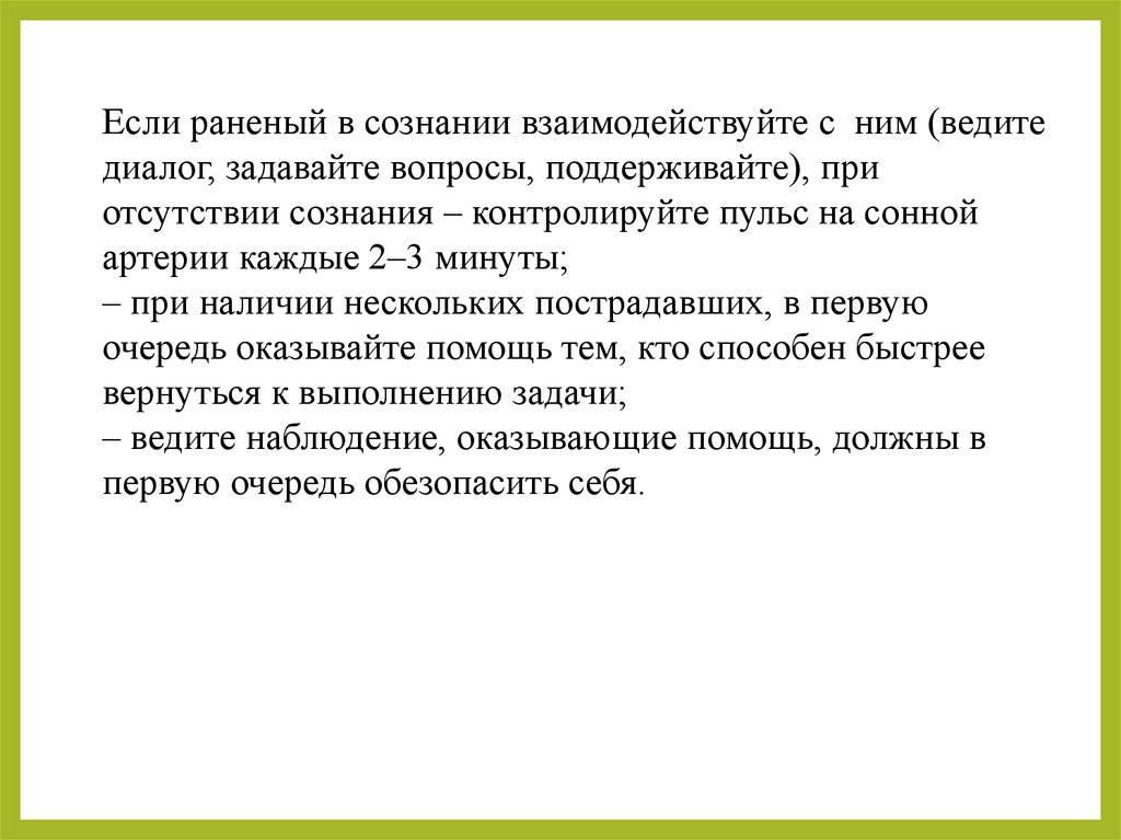 Если раненый в сознании взаимодействуйте с ним (ведитедиалог, задавайте вопросы, поддерживайте), при