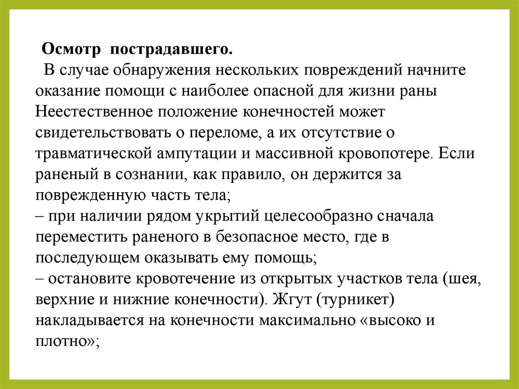 Осмотр пострадавшего.В случае обнаружения нескольких повреждений начните