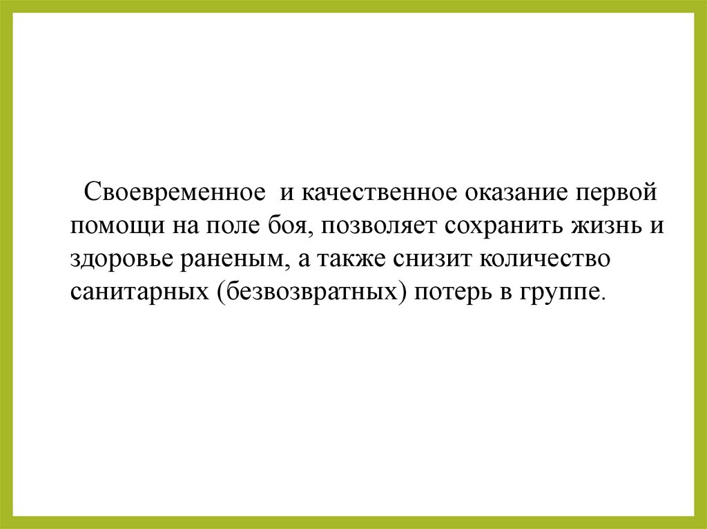 Своевременное и качественное оказание первойпомощи на поле боя, позволяет сохранить жизнь и