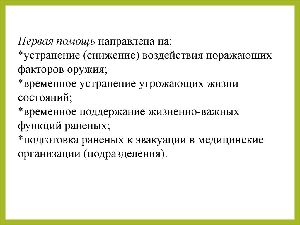Первая помощь направлена на:*устранение (снижение) воздействия поражающих