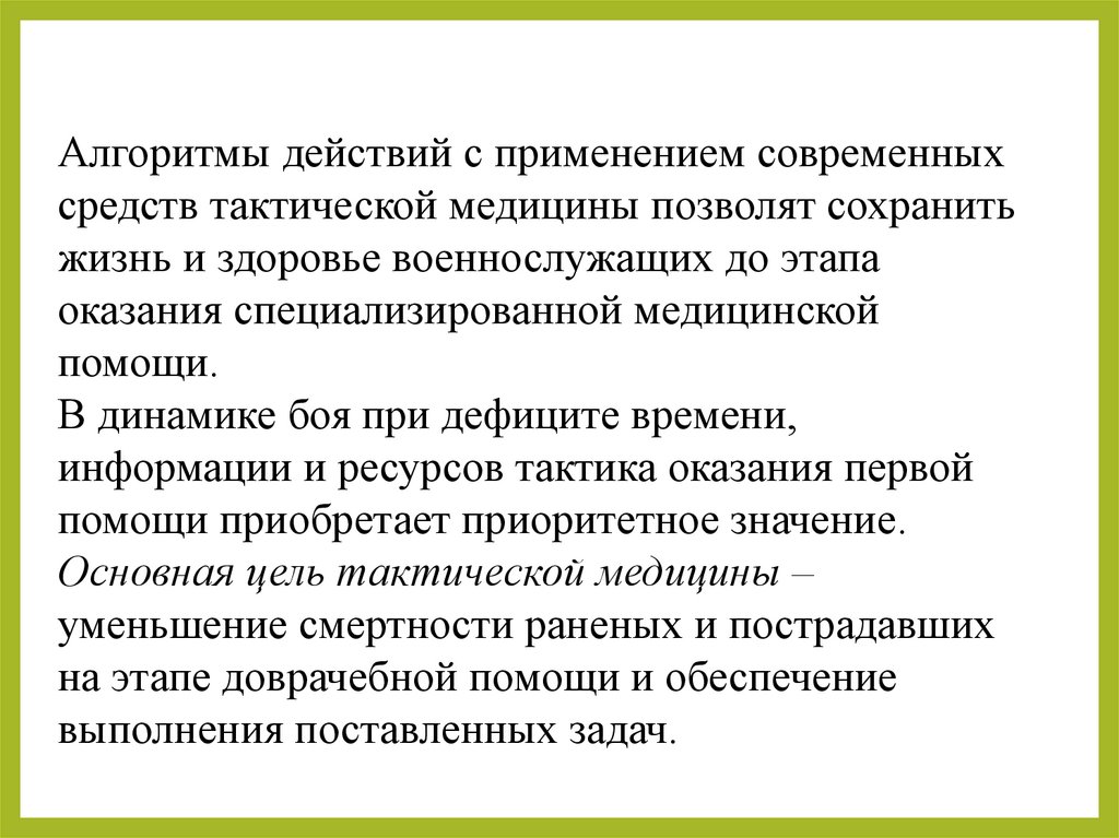 Алгоритмы действий с применением современныхсредств тактической медицины позволят сохранить
