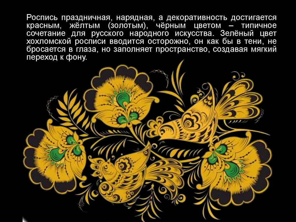 Роспись праздничная, нарядная, а декоративность достигаетсякрасным, жёлтым (золотым), чёрным цветом – типичное