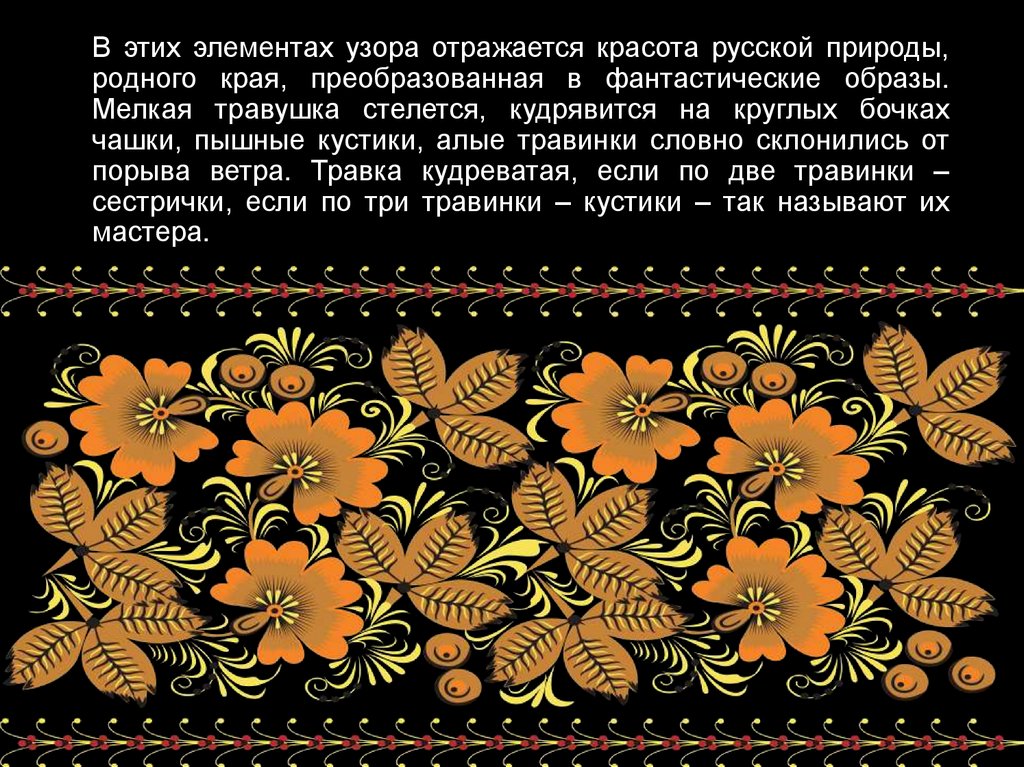 В этих элементах узора отражается красота русской природы,родного края, преобразованная в фантастические образы.