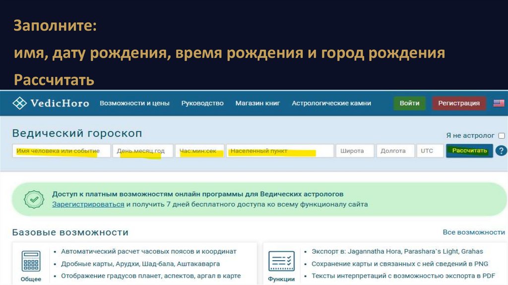 Заполните:имя, дату рождения, время рождения и город рождения
