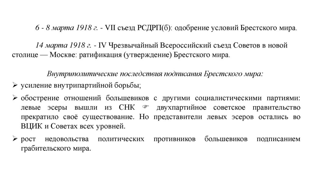 6 - 8 марта 1918 г. - VII съезд РСДРП(б): одобрение условий Брестского мира.14 марта 1918 г. - IV Чрезвычайный Всероссийский съезд Советов в новой