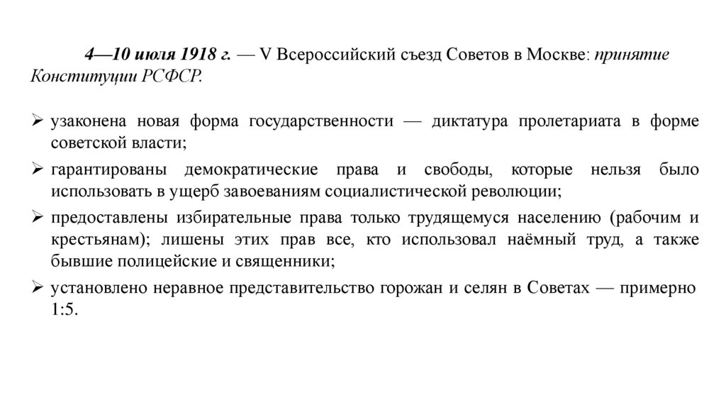 4—10 июля 1918 г. — V Всероссийский съезд Советов в Москве: принятиеКонституции РСФСР.
