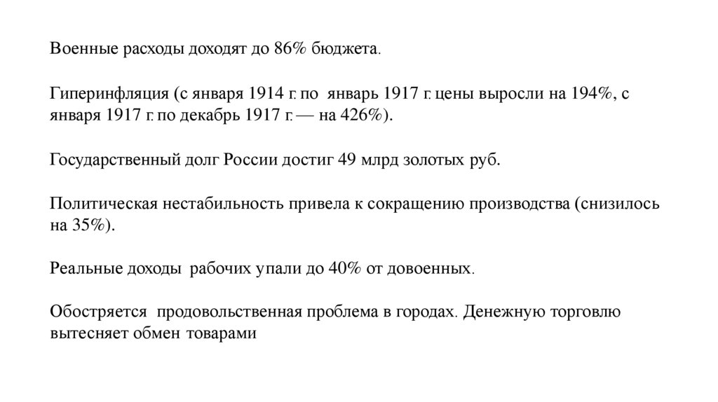 Военные расходы доходят до 86% бюджета.Гиперинфляция (с января 1914 г. по январь 1917 г. цены выросли на 194%, с