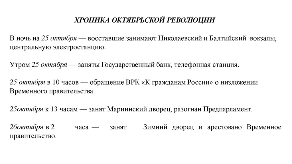 ХРОНИКА ОКТЯБРЬСКОЙ РЕВОЛЮЦИИВ ночь на 25 октября — восставшие занимают Николаевский и Балтийский вокзалы,
