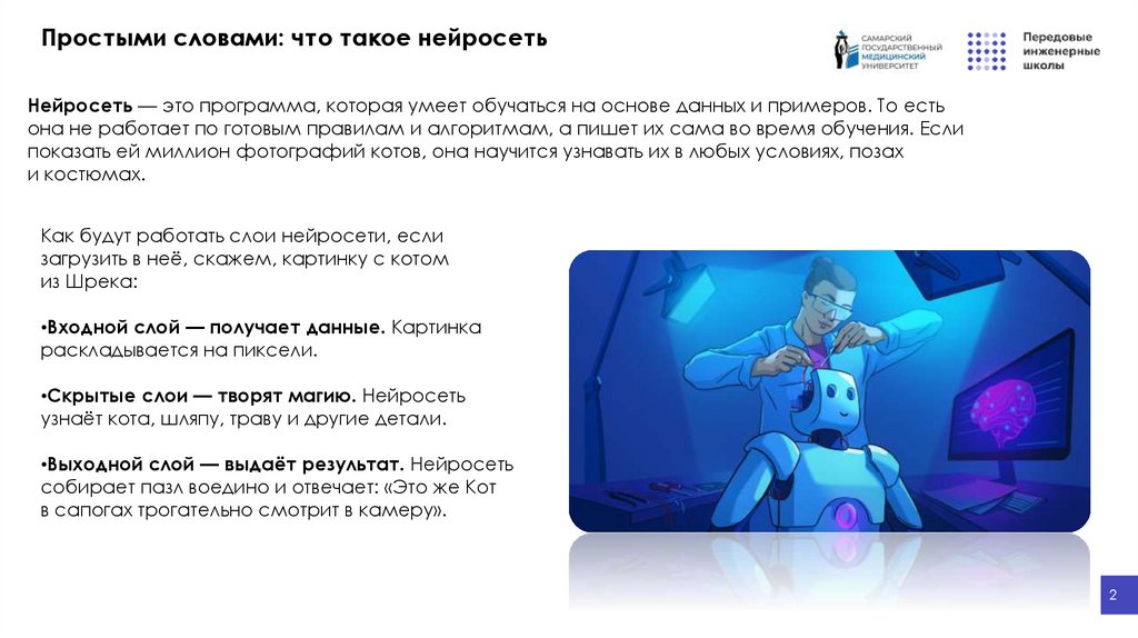 Простыми словами: что такое нейросетьНейросеть — это программа, которая умеет обучаться на основе данных и примеров. То есть