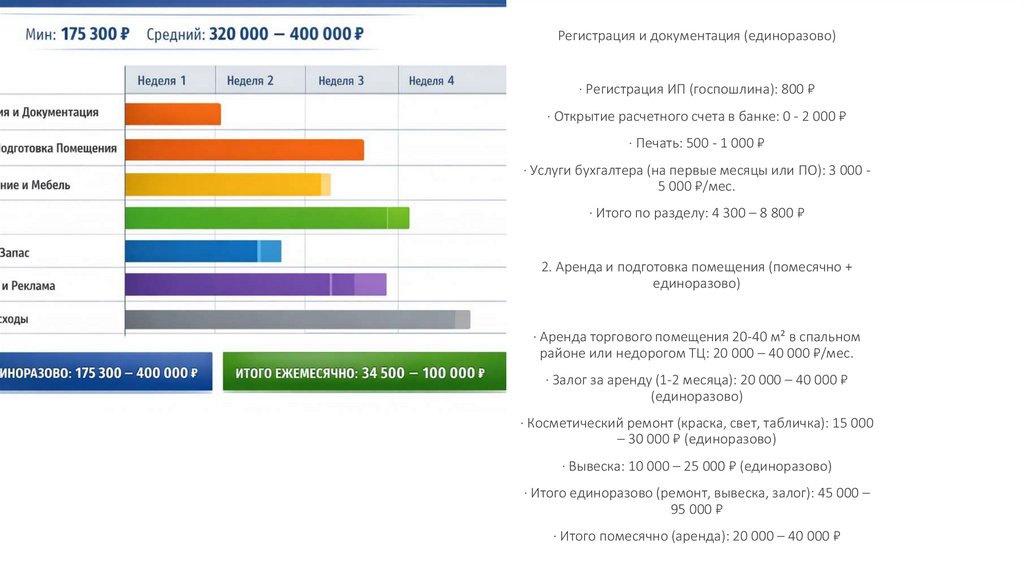 Регистрация и документация (единоразово)· Регистрация ИП (госпошлина): 800 ₽