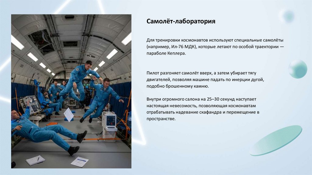 Самолёт-лабораторияДля тренировки космонавтов используют специальные самолёты